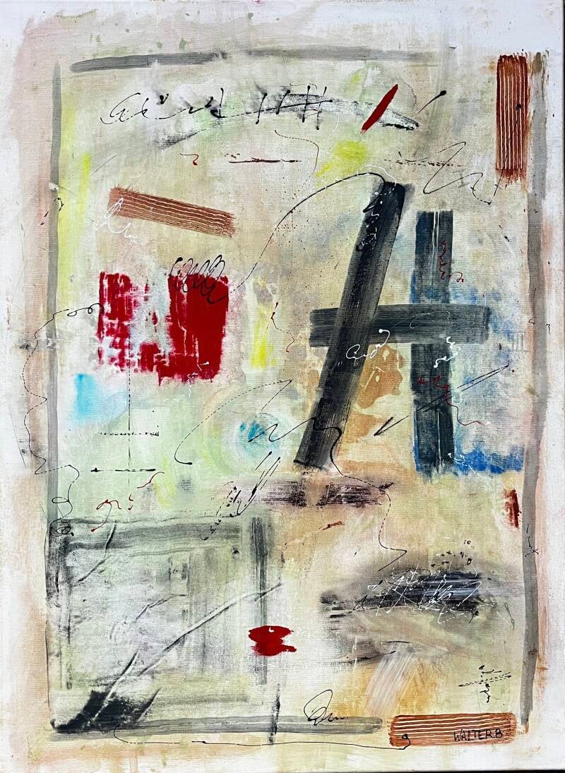 La peinture que vous montrez est une œuvre d'art abstrait de Patrice Walter Biarent, un artiste belge contemporain connu sous le nom d'artiste Walter B. L'œuvre est signée "WALTER B." dans le coin inférieur droit.